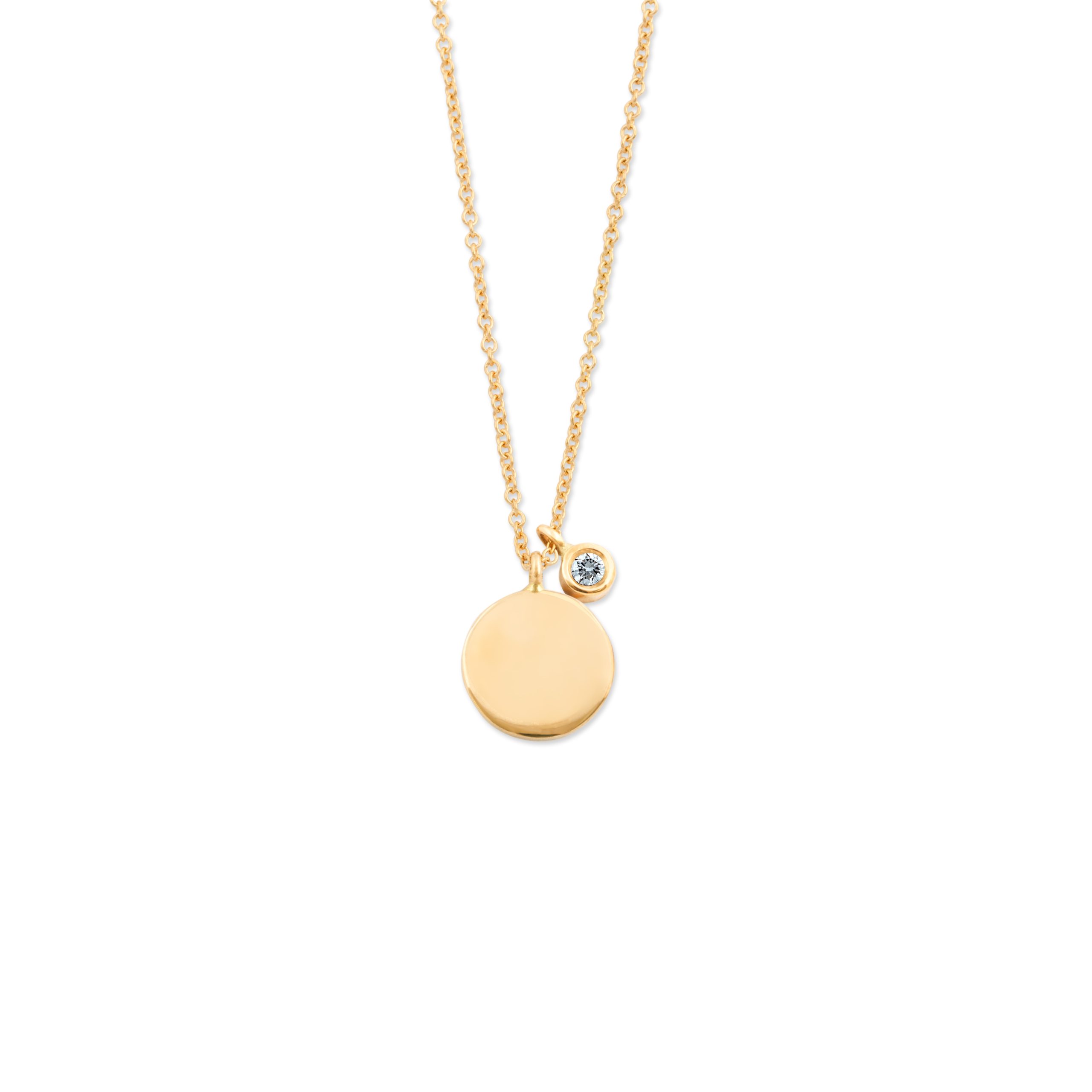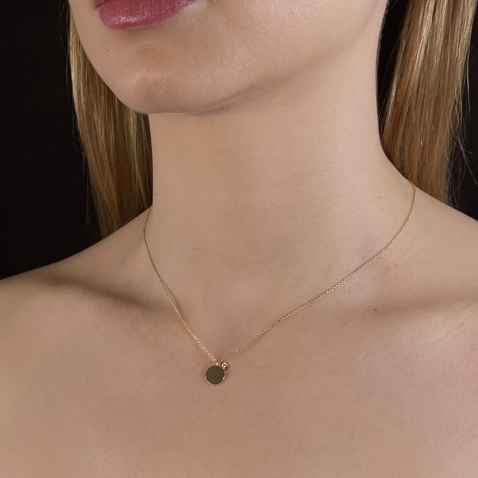 Handgjort halsband med rund platta och litet hänge med briljantslipad diamant 0.03ct TW/VS i återvunnet 18k guld.