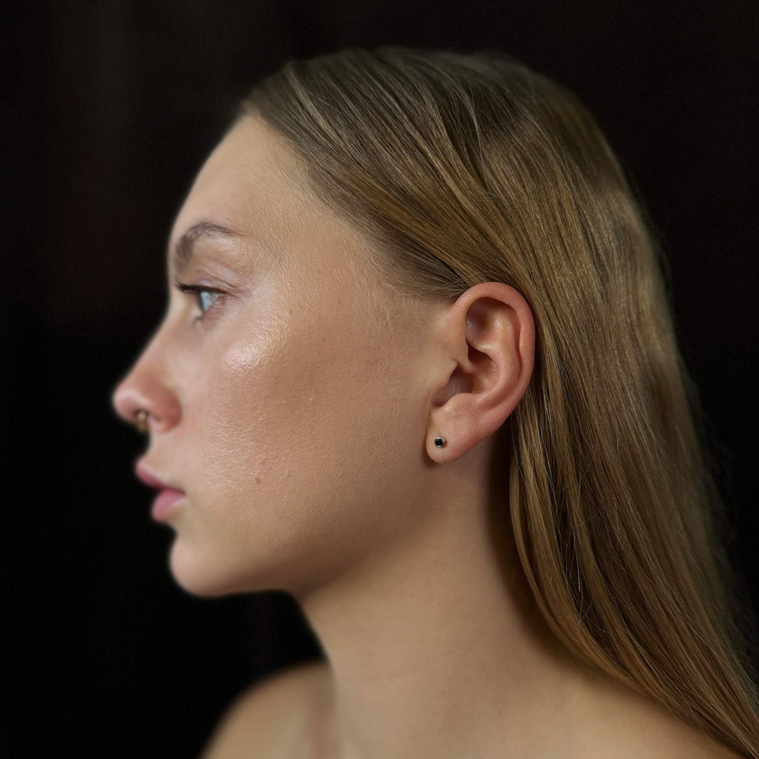 Handgjorda örhängen på stift i återvunnet 18k vitguld med briljantslipad svart diamant.